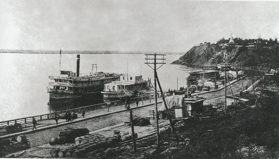 На старой фотографии видна пристань и пароходы. Пароходство как направление деятельности стало развиваться в Хабаровске в конце 19 - начале 20 веков. Сам Хабаровск получил статус города в 1880 году. До того это был военный пост Хабаровка, который основали солдаты 13-го линейного батальона во главе с капитаном Яковом Дьяченко, высадившиеся у тогда еще лесистых берегов Амура в 1858 году. В 1884 году Хабаровск стал административным центром Приамурского генерал-губернаторства.