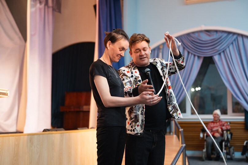 А когда началось «серебряное шоу» Игоря Романишина, и тысячи блестящих лент фольги осыпали зал, восторгу не было предела! Даже те, кто передвигается на колясках, с детским азартом ловили и подбрасывали «сугробы» из блесток, смеясь от души.