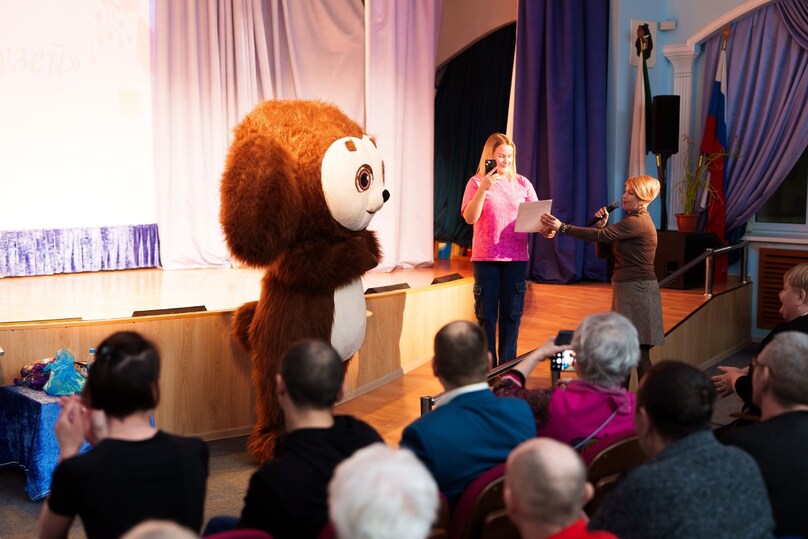 Еще в холле, перед концертом, всех встречает огромный пушистый Чебурашка. Ростовая кукла забавляет постояльцев, а те, словно малыши, с искрящимися от радости глазами, обнимают зверька и фотографируются с ним. Вот бабушка в нарядном платье, забыв про палочку, ловко делает селфи на телефон. «Для внучки отправлю! Пусть видит, какой у меня праздник!» — сияет она. А парень на коляске нежно поправляет Чебурашке бантик.