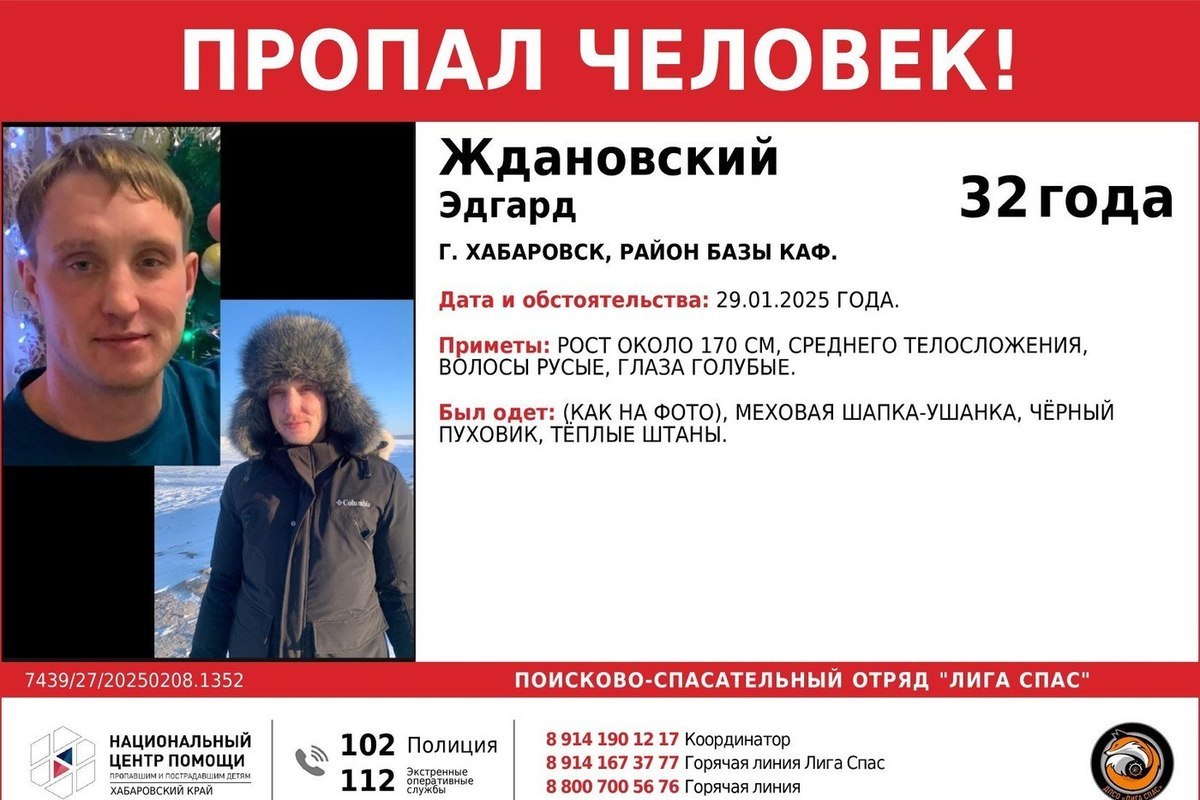 В Хабаровске идут поиски 32-летнего Ждановского Эдгарда. Последний раз видели в районе базы КАФ 29 января 2025 года, сообщает ДПСО ЛигаСпас.