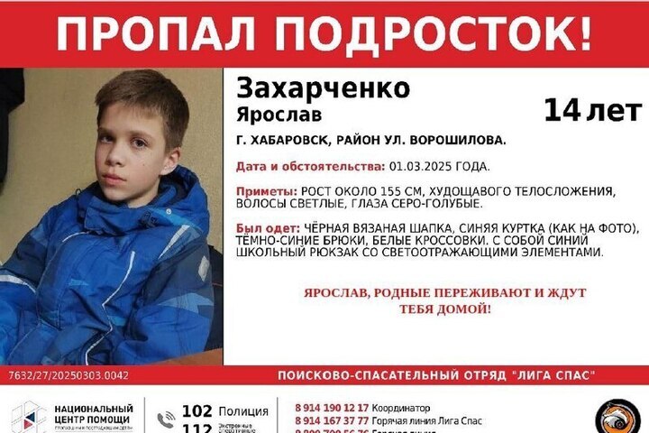 В Хабаровске продолжаются поиски 14-летнего Ярослава Захарченко - мальчик пропал 1 марта в районе улицы Ворошилова, об этом сообщает ДПСО ЛигаСпас.