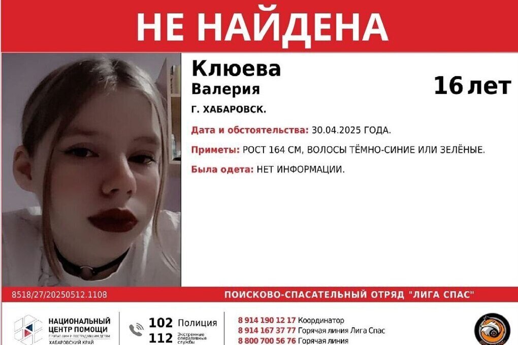 В Хабаровске уже больше двух недель разыскивают 16-летнюю Валерию Клюеву. Как сообщает ДПСО «Лига Спас», девушка пропала  30 апреля 2025 года.