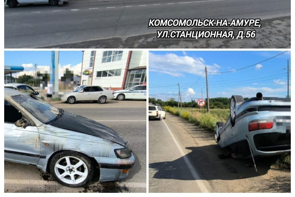 В Комсомольске-на-Амуре 23 июле 63-летняя водитель Toyota Probox при повороте налево с заправки по улице Станционной, 56, не уступила дорогу 22-летнему водителю Toyota Caldina. Из-за столкновения Caldina перевернулась на крышу.