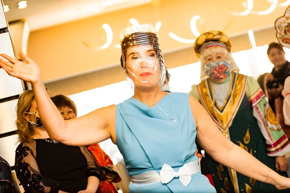 Придумали организаторы «Кухни без границ» и другой способ, обратить внимание на необходимость беречь себя от заражения коронавирусом: на церемонии открытия фестиваля устроили показ масочных мод. Номинации придумали три: «Национальный орнамент», «Гламур» и «Корпоративный стиль». Но участницы дефиле порой проявляли креатив, который ни к одной из категорий не относился.