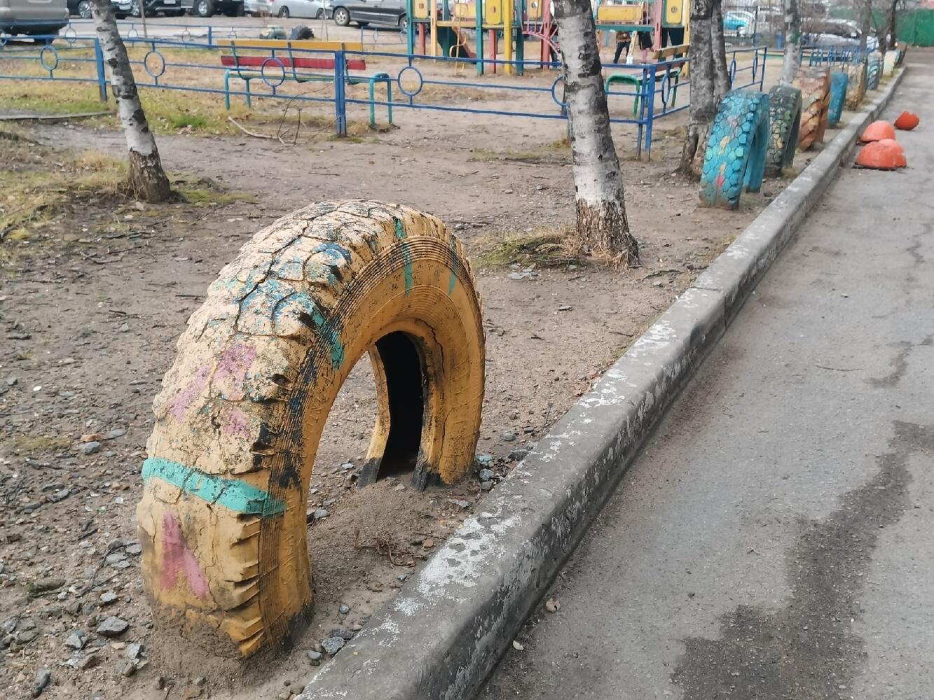 Во дворе дома на улице Большая, 4 разбитый асфальт, старые качели, горки и карусели, которые не красили годами. Дети взбираются на площадку по ржавому железу. Вдоль дороги множество шин от колес - похоже, их тоже давно не красили, к тому же такой декор относится к отходам III-IV группы опасности.