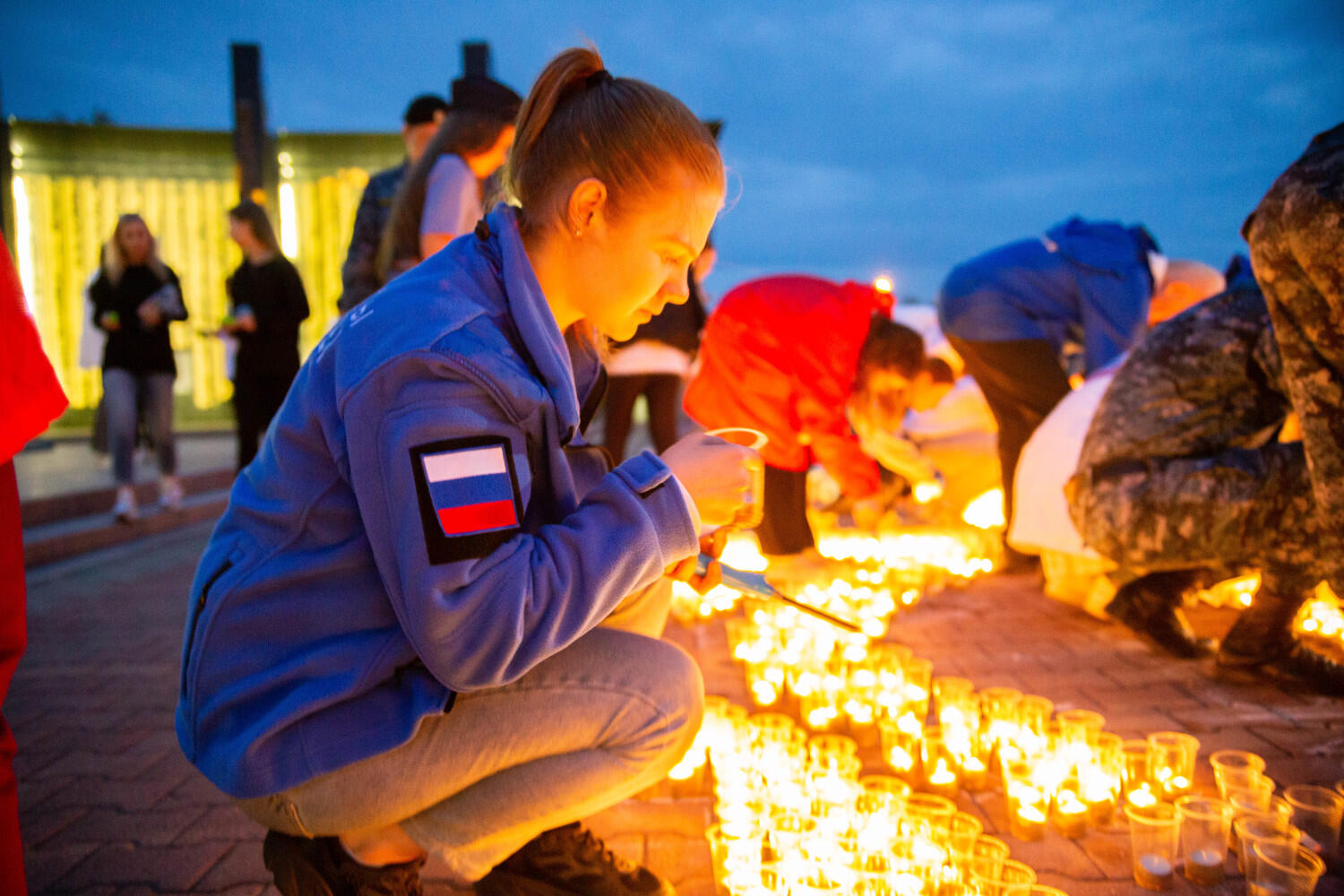 На площади Славы вечером 21 июня активисты Всероссийского общественного движения «Волонтеры Победы» и неравнодушные жители Хабаровска выложили «Огненную картину войны», посвященную событиям 1941-1945 годов. Из восьми тысяч свечей получилось масштабное изображение танка Т-34 и надпись «ХАБАРОVСК ПОМНИТ». Фото с акции в нашем фоторепортаже.