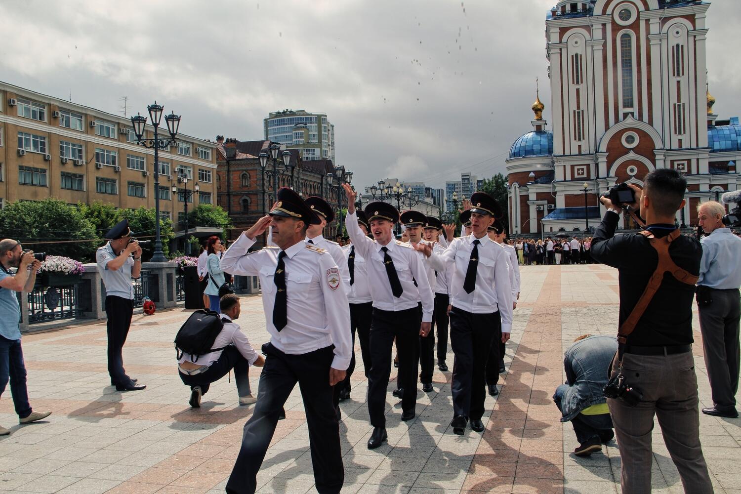 Свой выпускной отметили слушатели пятого курса ДВЮИ МВД на площади «Город воинской славы» в Хабаровске. Первыми долгожданные дипломы получили отличники - в их документах нет ни одной отметки «хорошо». За это они получили не только красные корочки, но и золотые медали. Следом торжественную церемонию прошли остальные выпускники. После, уже в статусе лейтенантов полиции, они прошли маршем по площади и закончили свой выпускной денежным дождем, крича «ура», пока монеты были в воздухе. Теперь уже бывших слушателей ждет их первая работа - уже через месяц все новоприбывшие полицейские будут распределены во все районы Хабаровского края.