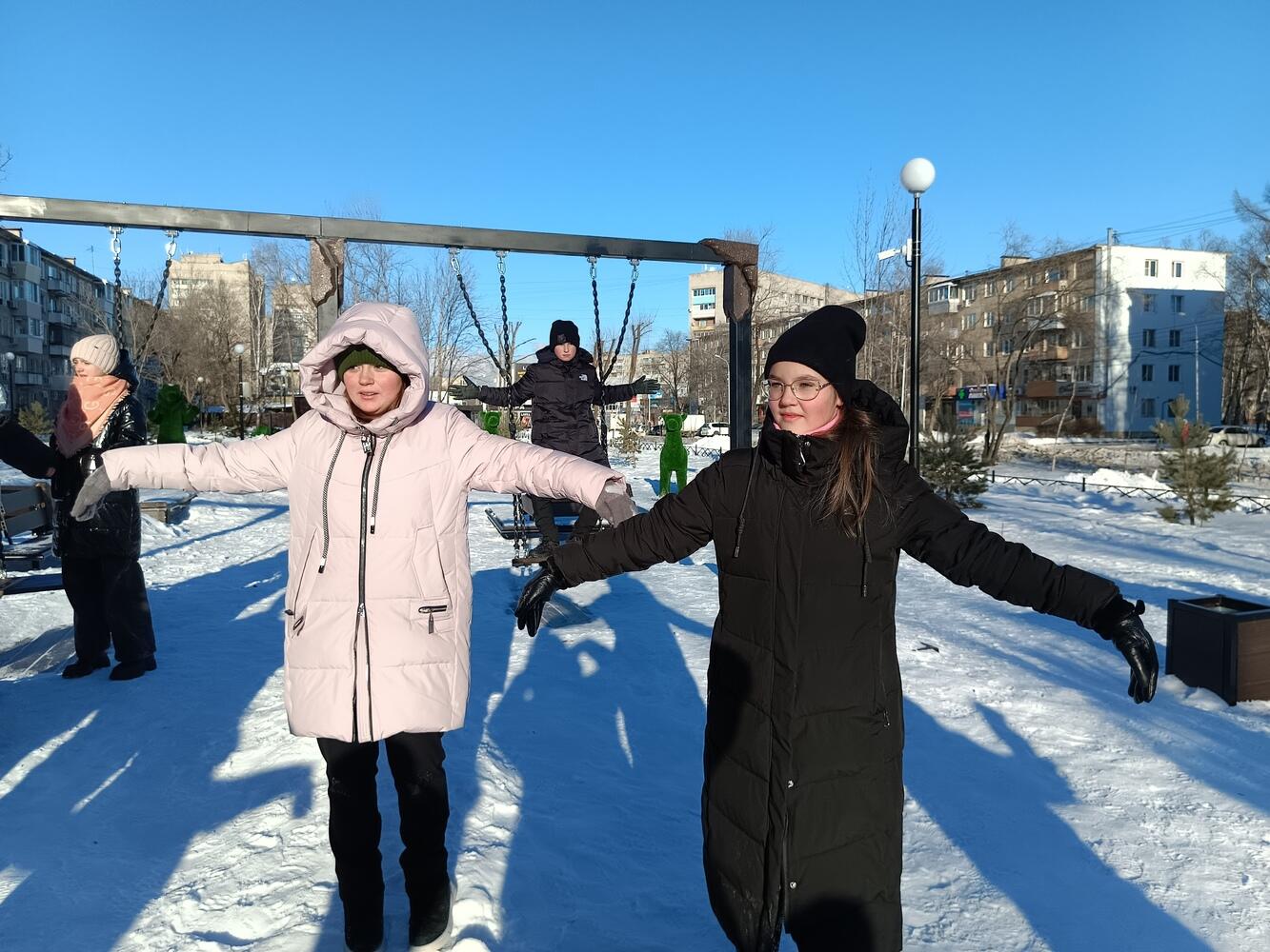 Игры и танцы устроили хабаровчане в сквере « Большой Хехцир», в Индустриальном районе Хабаровска. Здесь прошел праздник для детей «Здравствуй Зимушка-Зима».