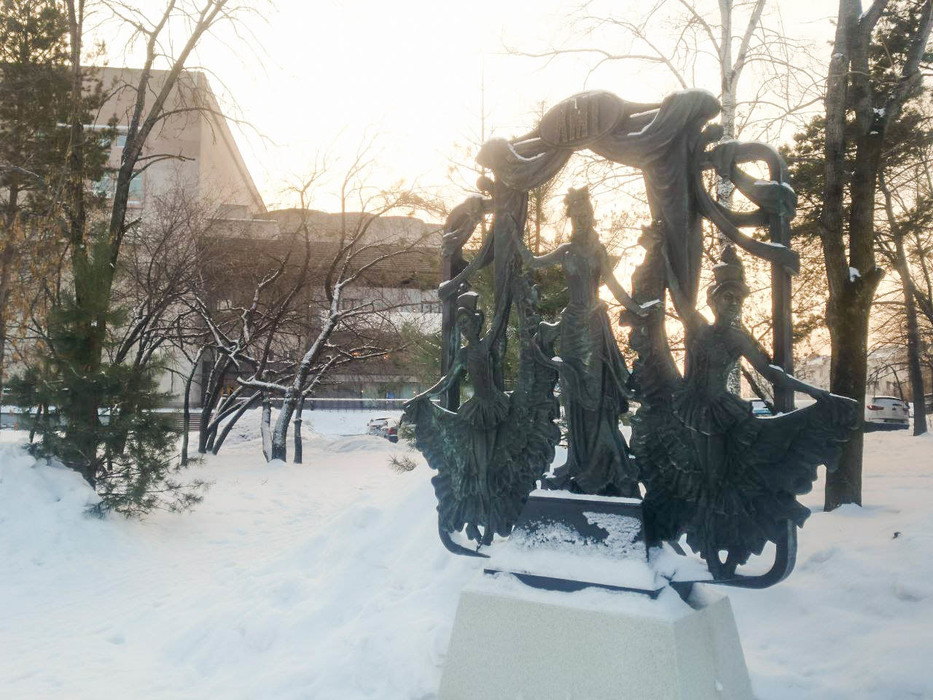 Театральный сквер открыли в Хабаровске еще в 2020 году и сейчас в преддверии новогодних праздников это место радует всех, кто спешит в краевой музыкальный театр или администрацию города. На фоне белоснежных деревьев, сквер с бронзовыми скульптурами, посвященными театру кукол и театру юного зрителя, выглядит не менее красиво, чем в летнее время.