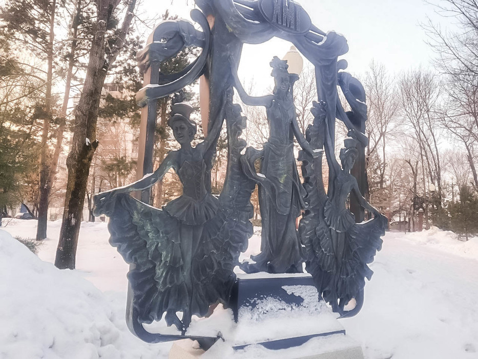 Театральный сквер открыли в Хабаровске еще в 2020 году и сейчас в преддверии новогодних праздников это место радует всех, кто спешит в краевой музыкальный театр или администрацию города. На фоне белоснежных деревьев, сквер с бронзовыми скульптурами, посвященными театру кукол и театру юного зрителя, выглядит не менее красиво, чем в летнее время.