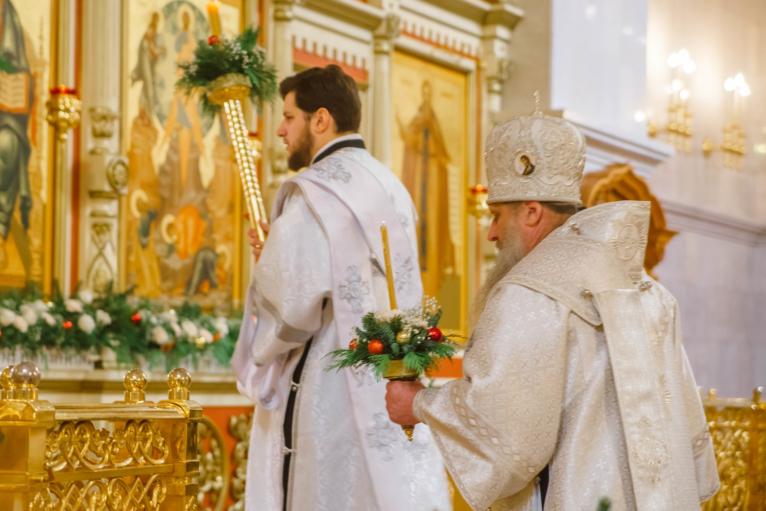 Уже на службе в храме запах хвои перемешался с ароматом ладана и восковых свечей, по всему кафедральному собору расставлены украшенные елочки, на улице, справа от входа, появился рождественский вертеп: волхвы и пастухи пришли к Святому семейству, чтобы поклониться Спасителю, лежащему в яслях.