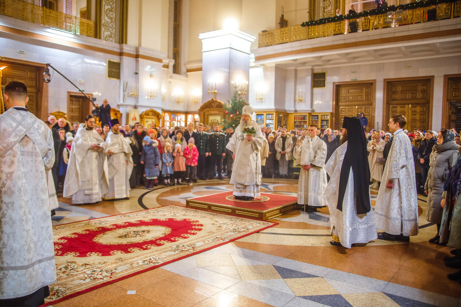 Уже на службе в храме запах хвои перемешался с ароматом ладана и восковых свечей, по всему кафедральному собору расставлены украшенные елочки, на улице, справа от входа, появился рождественский вертеп: волхвы и пастухи пришли к Святому семейству, чтобы поклониться Спасителю, лежащему в яслях.