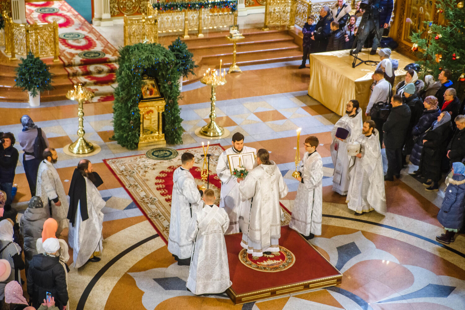 Уже на службе в храме запах хвои перемешался с ароматом ладана и восковых свечей, по всему кафедральному собору расставлены украшенные елочки, на улице, справа от входа, появился рождественский вертеп: волхвы и пастухи пришли к Святому семейству, чтобы поклониться Спасителю, лежащему в яслях.