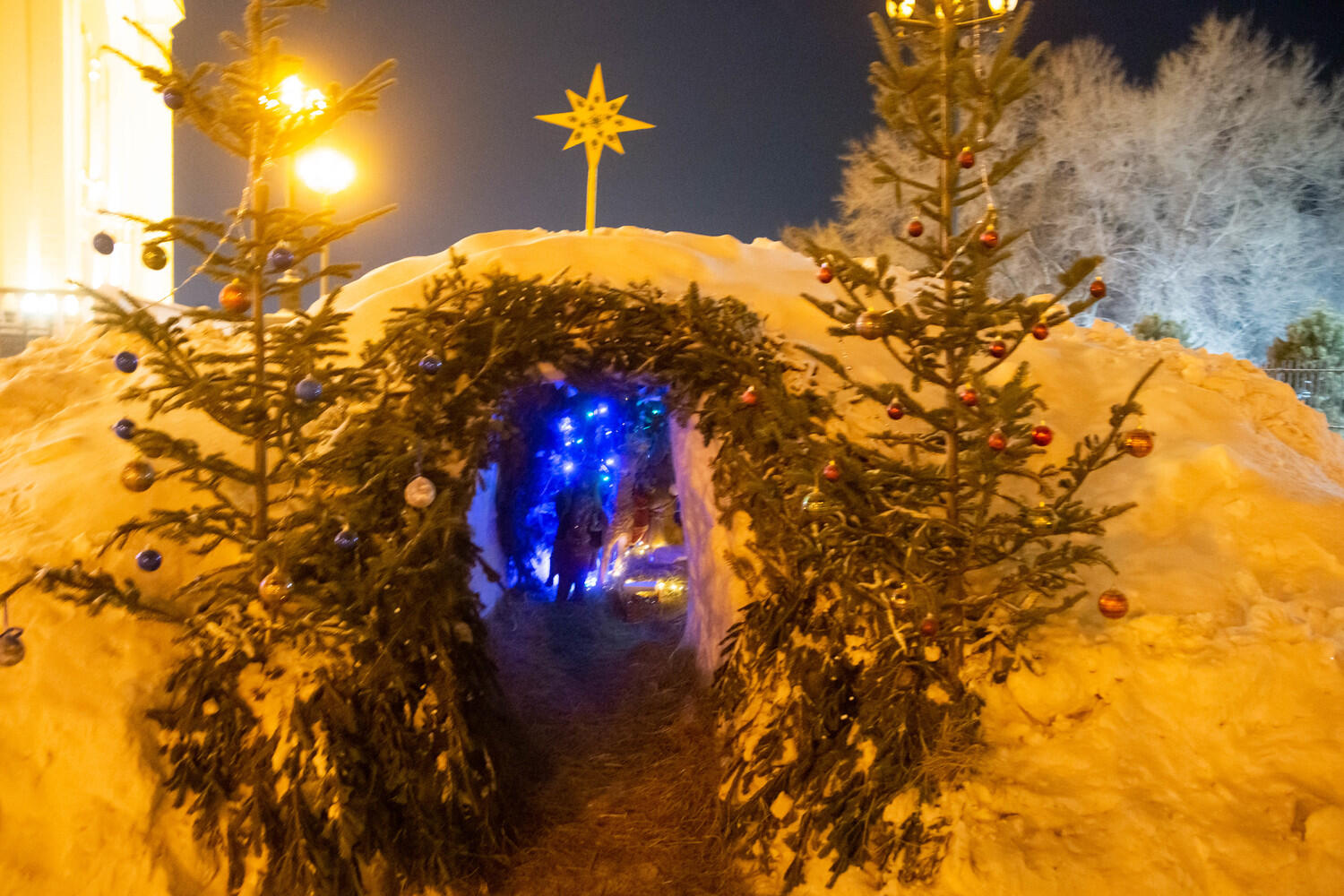 Уже на службе в храме запах хвои перемешался с ароматом ладана и восковых свечей, по всему кафедральному собору расставлены украшенные елочки, на улице, справа от входа, появился рождественский вертеп: волхвы и пастухи пришли к Святому семейству, чтобы поклониться Спасителю, лежащему в яслях.