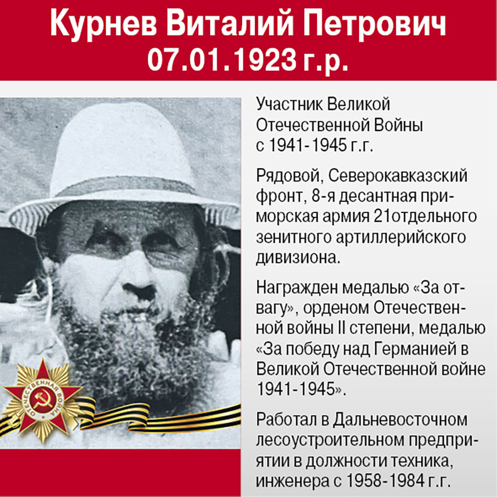 Дальневосточный филиал Всероссийской лесоучетной организации «Рослесинфорг» «Дальлеспроект» расскажет вам о ветеранах-лесоустроителях, кто отдал свою жизнь за мирное будущее, кто с Победой возвратился на Родину и кто дни и ночи ковал ее в тылу.