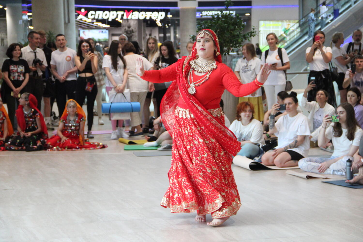 Более 400 человек создали «море белого» на третьем этаже одного из торговых центров. Под руководством инструкторов хабаровчане синхронно выполняли асаны, дышали в такт и медитировали. Гвоздь программы — буквально — площадка гвоздестояния: от студентов до пенсионеров смело пробовали силы. В углу — группа новичков впервые открывает для себя позу «дерева», а бабушка в белом одеянии улыбается, балансируя на одной ноге. На втором плане — дети повторяют движения за индийскими танцовщицами. Энергия тишины среди торговых витрин — вот главное чудо дня!