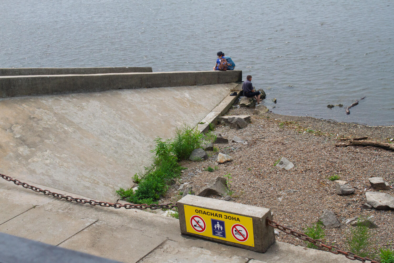 Ну а кто-то предпочитает ловить рыбу, хотя в такой мутной воде (так всегда после подъема уровня реки) я бы поостерегся. Мало ли чего там принесло. Те, кто вышел позагорать на пляж, с грустью рассматривают таблички, запрещающие купаться. И правильно — слишком много в этом году несчастных случаев на воде.