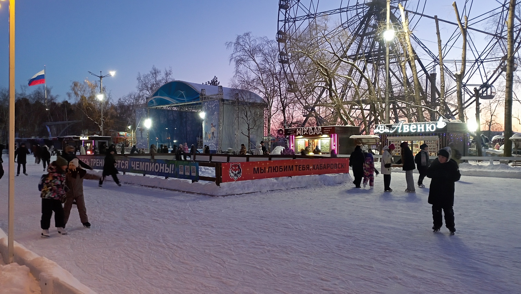 Наступили новогодние каникулы, которые не все проводят дома. Самые активные и смелые под вечер спешат на набережную стадиона имени Ленина в Хабаровске, чтобы вдоволь повеселиться на катке, поиграть в хоккей и полюбоваться игрушками, созданными юными мастерами. На коньки становятся целыми семьями и вместе с друзьями. Это излюбленное место и для активного досуга молодежи.