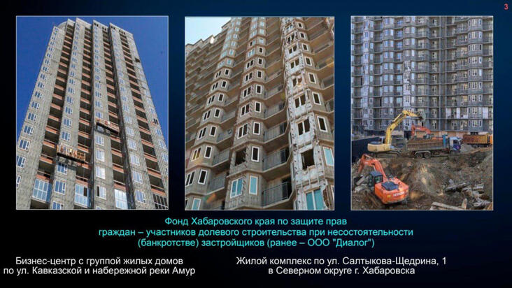 Сейчас при содействии фонда ведется достройка трех проблемных домов компании «Диалог» - двух на улице Салтыкова-Щедрина и одного на улице Кавказской. Общее число дольщиков компании превысило девятьсот человек. Сейчас достройку дома на Кавказской ведет компания «Звезда», на объекте идут работы по монтажу инженерных сетей и внутренних перекрытий, а также благоустройству придомовой территории. Достройку ЖК на Салтыкова-Щедрина ведет компания ООО «ДВ Строй». Здесь ведутся общестроительные работы: усиление железобетонных конструкций, устройство лестниц, парапетов, балконов, монтаж инженерных систем. Все идет по утвержденному графику, отставаний нет. Вопрос по достройке домов ООО «Диалог» удалось решить благодаря достигнутым договоренностям о привлечении федеральных средств между губернатором, заместителем председателя Правительства РФ Маратом Хуснуллиным и министром строительства и ЖКХ РФ Иреком Файзуллиным.