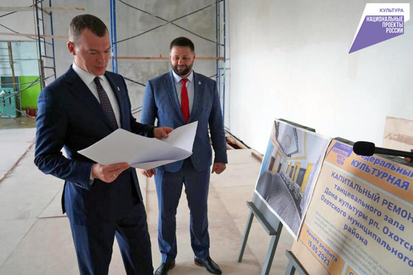 Находясь в Охотске, губернатор решил и лично проверить несколько объектов. Например, он посмотрел, как ремонтируют универсальный зал местного центра культурно-досуговой деятельности. Работы ведутся в рамках национального проекта «Культура».