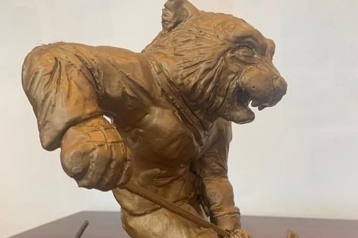 Это - памятник-символ местного хоккея с шайбой. Называется он "Сила тигра". Как предполагается, тигр появится на площади перед "Платинум ареной".