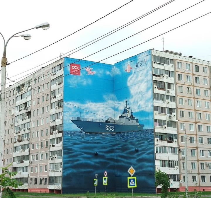 - Самая масштабная работа площадью от 500 квадратных метров, где мы изображали огромный корвет на двойном фасаде девятиэтажного дома, была в Комсомольске-на-Амуре в 2018 году. Этот проект заказала администрация Города юности, чиновники сами вышли на меня. Сначала хотели изобразить логотип города на домах, на что мы сказали, что лучше сделать что-то поинтереснее. Предложили корветы и самолеты.
