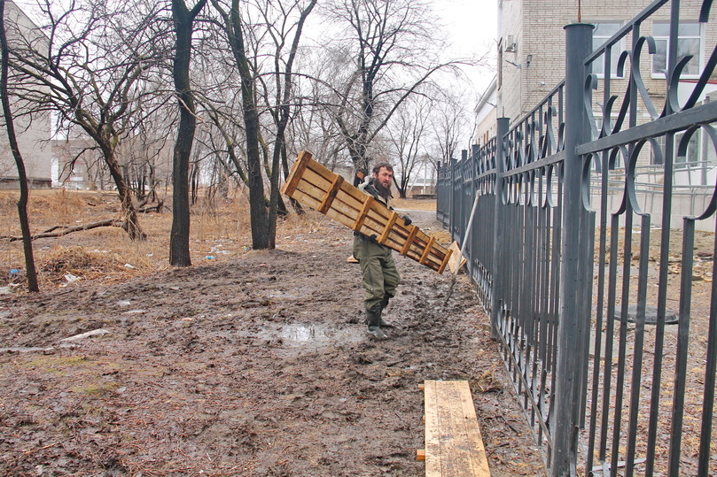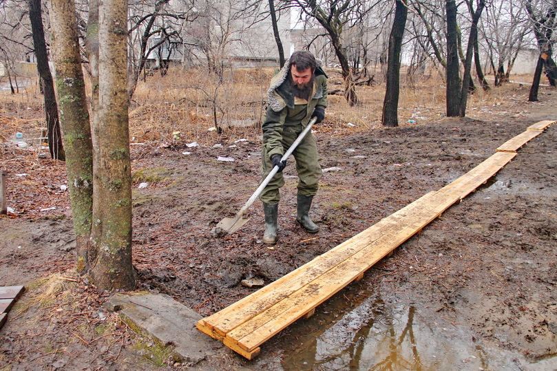 После подготовки грунта (активист орудовал лопатой примерно полчаса) начался ситуационный отвод воды. Гиви прокопал несколько канавок, которые немного осушили полузатопленный участок. Затем на грунт параллельно забору была уложена самодельная пешеходная дорожка длиной более десяти метров. Гиви несколько раз протестировал сооружение, пройдясь назад и вперед. Ни одна доска не деформировалась.
