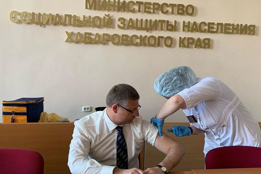 В Хабаровском крае продолжается прививочная кампания от коронавируса. По последним данным, 46 человек министерства социальной защиты населения во главе с министром Александром Дорофеевым прошли второй этап вакцинации. Прививку также сделали работники центра социальной поддержки населения и комплексного центра социального обслуживания населения.