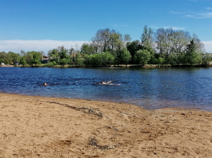 Официально купальный сезон в Биробиджане еще не открыт (обычно это происходит в начале июня), поэтому никто из спасателей на центральном городском пляже не дежурит. Отсутствие профессионалов, готовых прийти на помощь тонущим гражданам, не пугает отдыхающих. Так, например, несколько подростков, появившись из-за кустов, энергично прошагали по горячему песку в сторону водоема, разделись до трусов и стали пробовать воду.