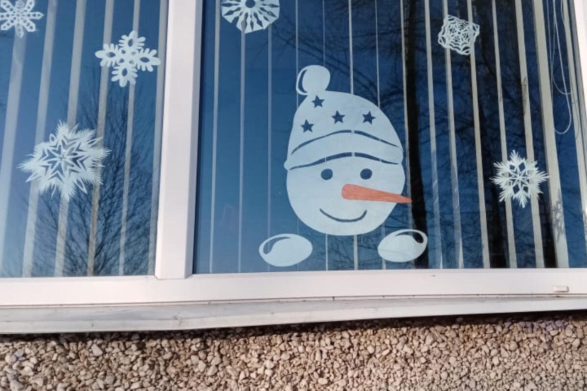 Красоту навели во школе №52 - здание хоть и не украшено, зато окна просто загляденье. В них кем-то старательно вырезанные бумажные фигуры, на территории школы-интерната №7 создали большого снежного тигра, разлегшегося прямо под гирляндой из флажков.