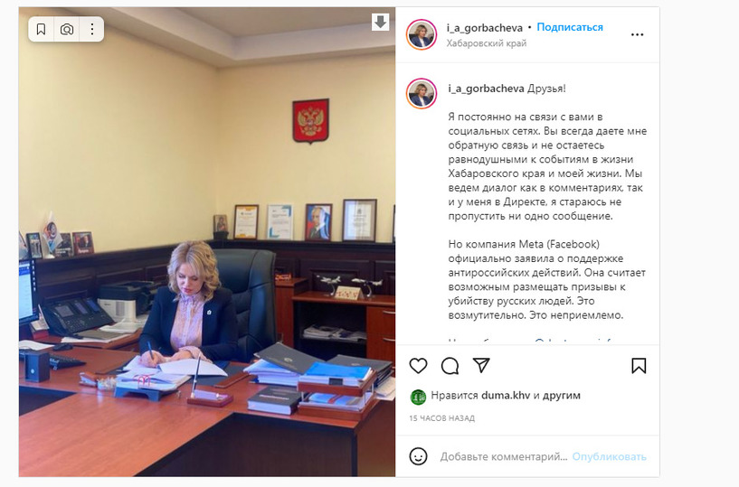 «Я постоянно на связи с вами в социальных сетях. Вы всегда даете мне обратную связь и не остаетесь равнодушными к событиям в жизни Хабаровского края и моей жизни. Мы ведем диалог как в комментариях, так и у меня в Директе, я стараюсь не пропустить ни одно сообщение. Но компания Meta (Facebook) официально заявила о поддержке антироссийских действий. Она считает возможным размещать призывы к убийству русских людей. Это возмутительно. Это неприемлемо».