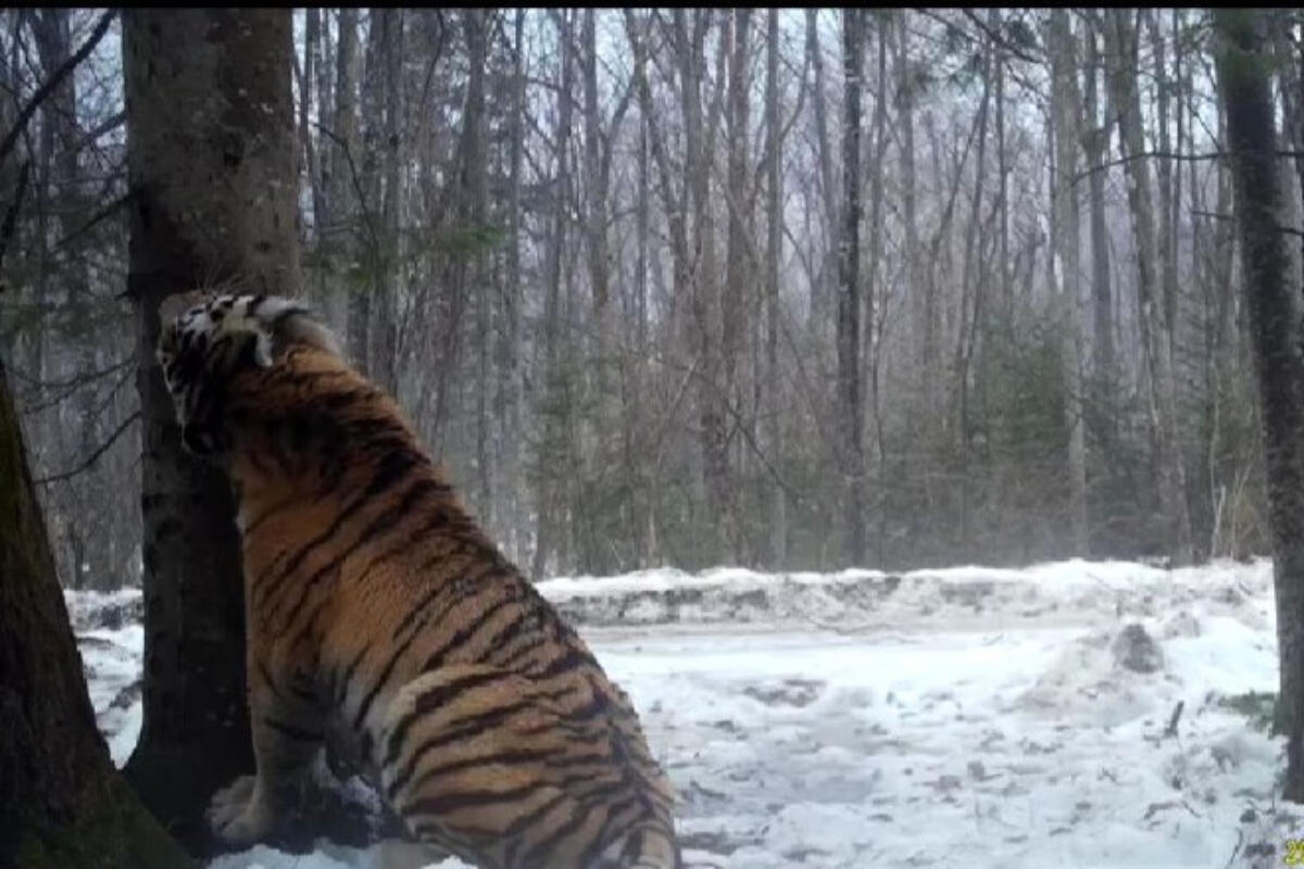 В Telegram-канале центра «Амурский тигр» появилось видео тигра Джека. Полосатый хищник буквально расчувствовался перед маркировочным деревом и даже покусал его.