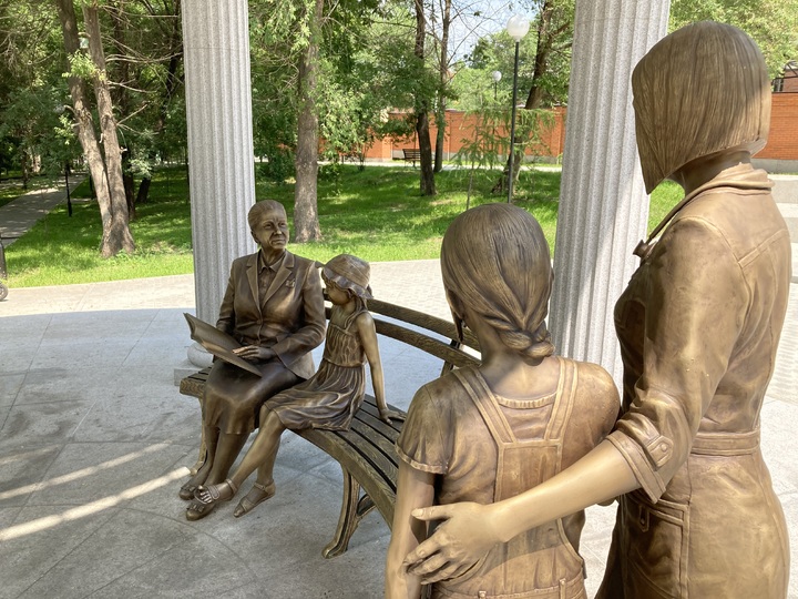 В ротонде - композиция скульптора Босова. На скамейке сидит заслуженная (судя по значку) учительница с внучкой, а сбоку стоит врач, наверное, с дочкой. Красиво, благообразно и вполне в духе актуальной повестки. У горожан скульптура вызвала неоднозначную реакцию. Кого-то пугала девочка, выполненная в каких-то странных пропорциях с потусторонним взглядом (мне, если честно, так не показалось, ну да мнение есть мнение). Кого-то расстраивало следование советскому мейнстриму, то, что получилось, что называется, «без изюминки».