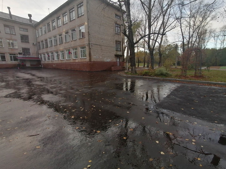 В день, когда мы посетили школу, шел дождь, и тогда отчетливо было видно, есть ли лужи и куда стекает вода на территории учебного заведения. Лишь в одном месте, с правой стороны от ворот, заметна небольшая неровность, но эта погрешность не так бросается в глаза.