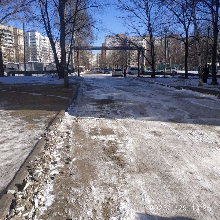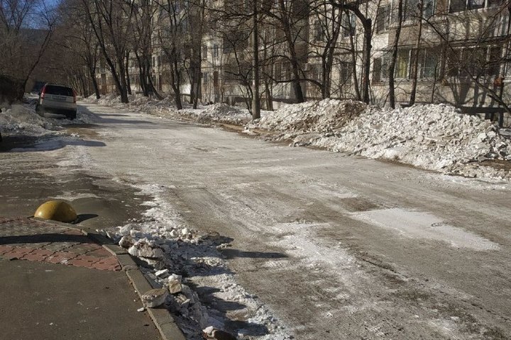 Снегоуборочную технику здесь впервые за много лет заметили на минувших выходных. Лед от дороги сейчас разложен ровными кучками по обочинам, да и сама дорога почищена только до детского садика №33. Но и это местные жители расценивают как прогресс.