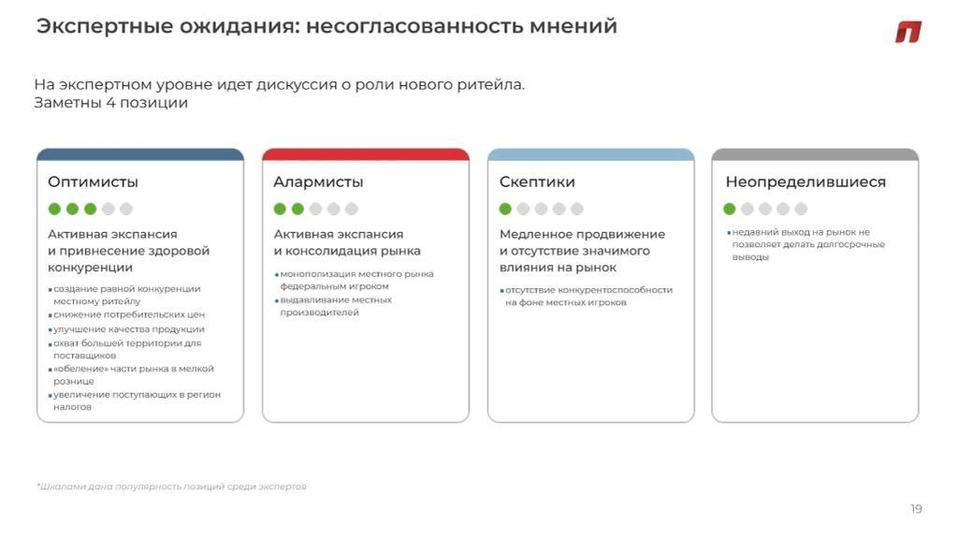 Ожидания экспертов от новых магазинов можно разделить на четыре категории. Так, «оптимисты» видят плюсы в привнесении на рынок здоровой конкуренции; «алармисты» опасаются монополизации; «скептики» считают, что у сетей нет перспектив в дальнейшем расширении из-за отсутствия выгодных свободных торговых площадей; «неопределившиеся» полагают, что пока невозможно оценить влияние нового игрока на рынок.