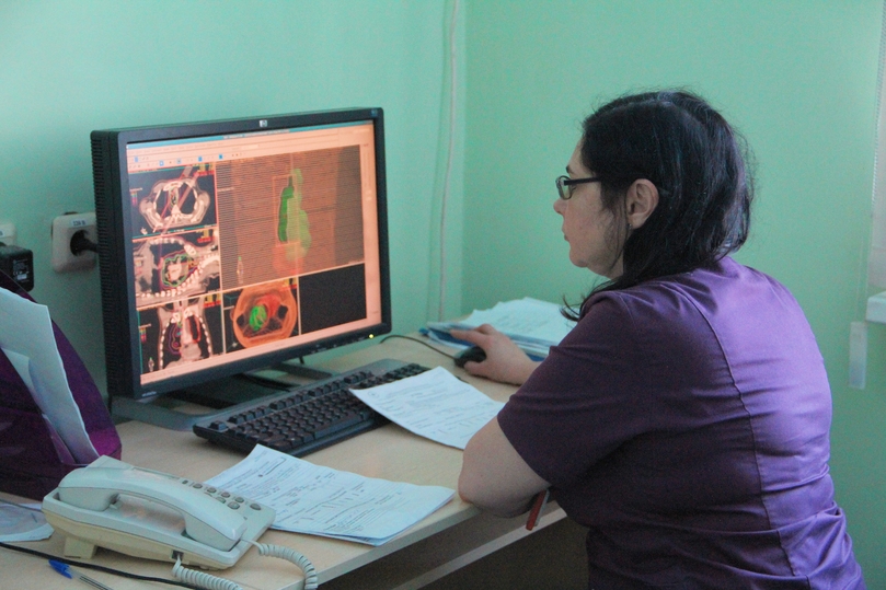 Мы отправляемся в отделение радиотерапии и отдел медико-физического сопровождения радиотерапии. Первыми нас встречают радиотерапевты – специалисты, которые составляют план лечения. Далее диагностический план направляется непосредственно к операторам аппарата. Процесс существенно автоматизирован, и наблюдать за процессом лечения медики могут в режиме онлайн.