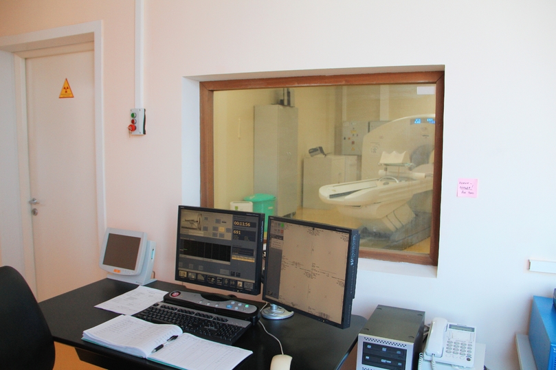 Мы проходим в помещение для операторов. В комнате, где установлен аппарат, уже находится пациент.