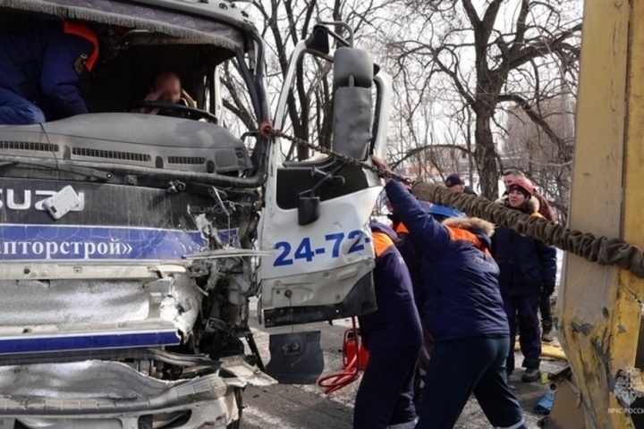 В Хабаровске в районе улиц Аэродромной и Целинной 29 февраля произошло ДТП, в котором пострадал водитель самосвала. Мужчине понадобилась помощь спасателей. Они деблокировали пострадавшего.