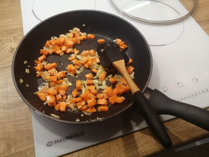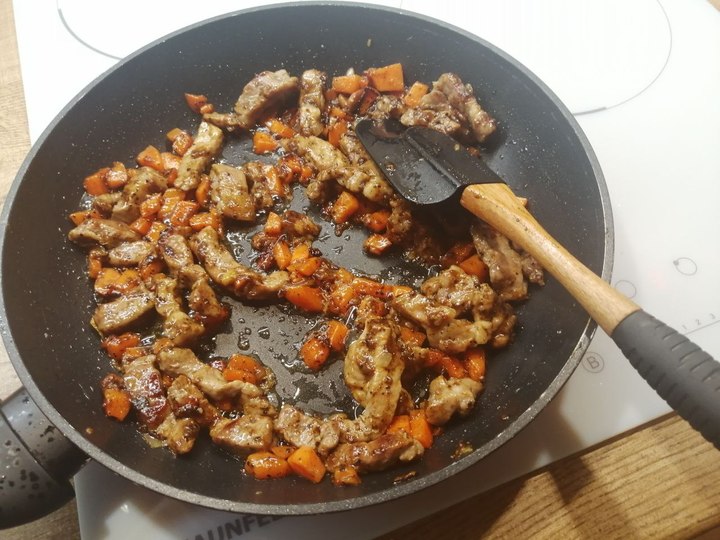 Морковь режем кубиками, лук и чеснок мелко крошим и обжариваем все вместе до золотистого цвета. Свинину режем, как на гуляш, добавляем к овощам и жарим до полной готовности. Затем добавляем перечный соус и пару ложек воды, готовим примерно 3-5 минут и, выключив огонь, даем блюду немного постоять, чтобы соус отдал мясу свой вкус.