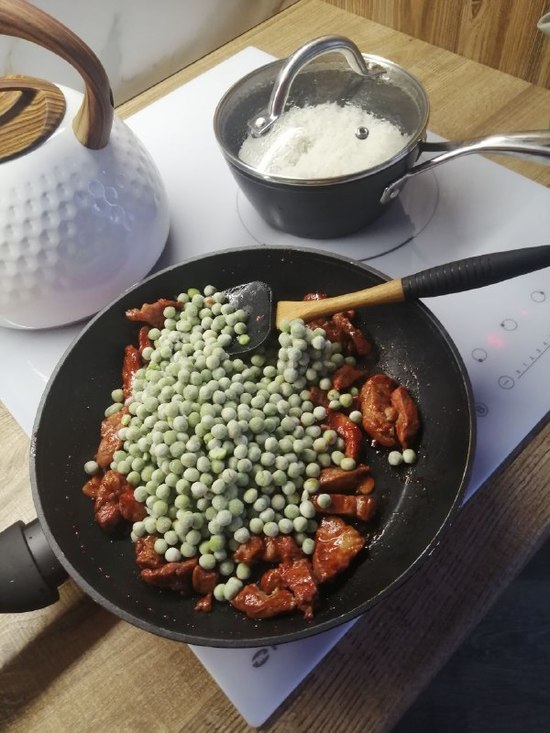 Убавляем огонь под сковородкой, высыпаем к мясу горошек, доливаем полстакана воды и соевый соус, закрываем крышку и пропариваем до готовности горошка - он должен стать мягким. Параллельно с этим варим рис для гарнира тем способом, который вам больше нравится - я использую стандартный, на стакан чисто вымытого риса полтора стакана подсоленной воды.