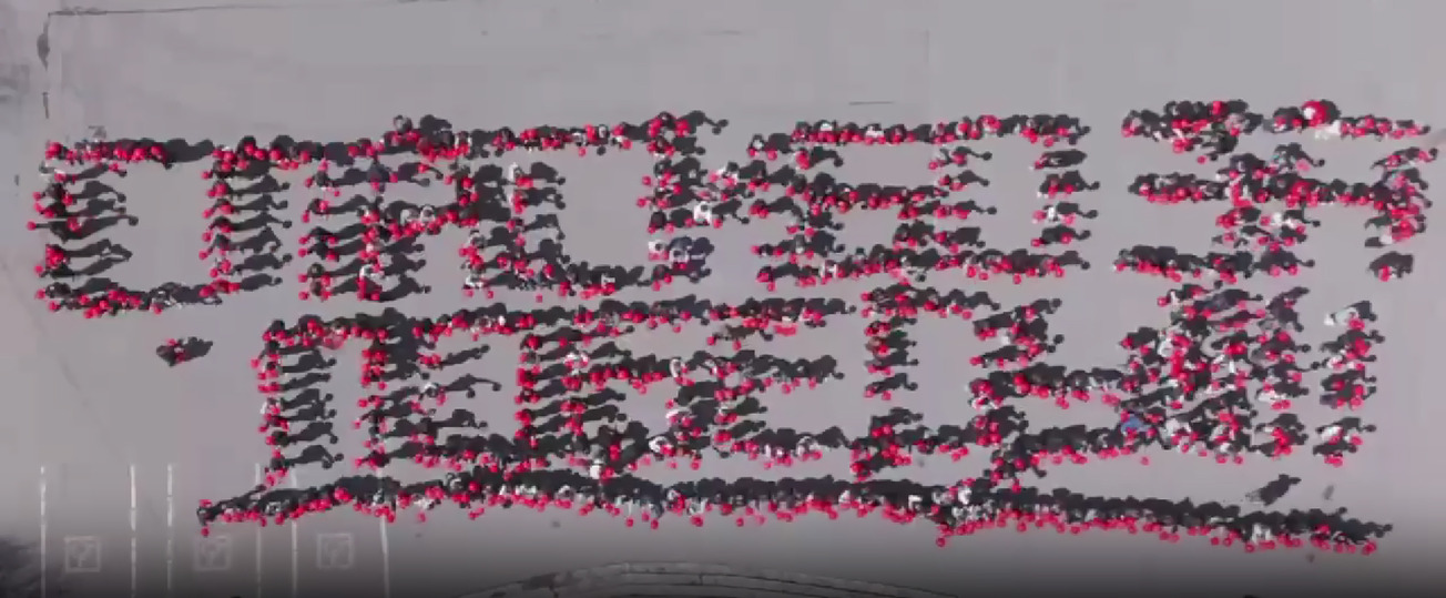 Вместе хабаровчане написали на асфальте благодарственную надпись «Спасибо за Победу!», но не мелом, а красными воздушными шарами. Акцию снимали с воздуха, откуда было видно, как горожане выстроились в форме букв и на собственном примере показали проявление патриотизма и единства.