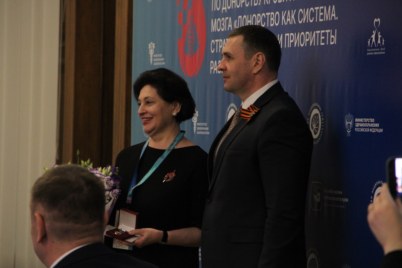 В рамках форума Хабаровский край отметил вклад краевой станции переливания крови в развитие донорства. Глава региона вручил учреждению почетный знак «За заслуги перед Хабаровским краем», подчеркнув достижения в области охраны здоровья, обеспечение высочайших стандартов безопасности донорского материала, а также активную работу по популяризации донорства крови и костного мозга. Награду от имени КГБУЗ «КСПК» приняла главный врач учреждения Оксана Кожемяко.