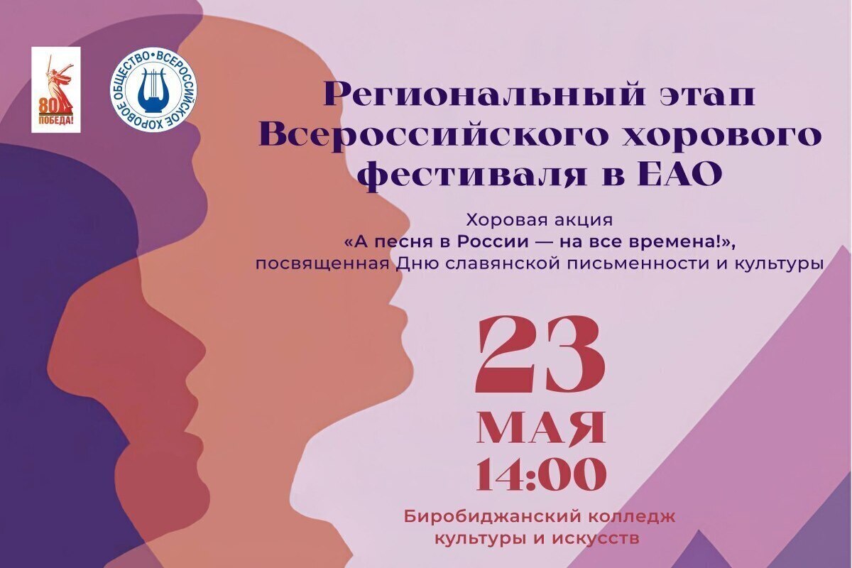 23 мая в Биробиджане состоится региональный этап Всероссийского хорового фестиваля, который пройдет совместно с хоровой акцией «А песня в России - на все времена!», посвященной Дню славянской письменности и культуры.Об этом сообщает мэрия города.