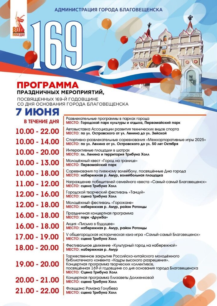 7 июня столица Амурской области отметит свой день рождения - в этом году ей исполнится 169 лет. В этот день в разных локациях города пройдут праздничные мероприятия. Об этом сообщает мэрия Благовещенска.