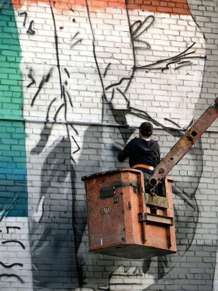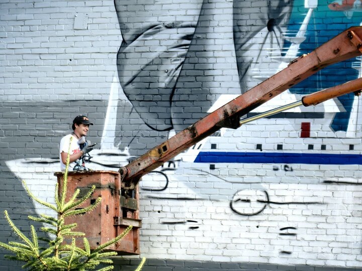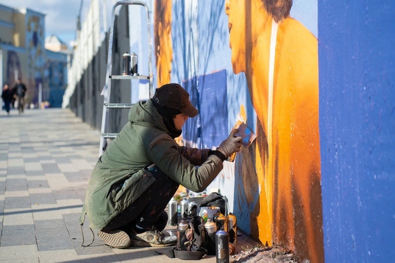 Чем ближе подходишь к муралу, тем сильнее ощущается запах свежей краски и четче проступают детали. Антон, заметив мой интерес, на десять минут отрывается от работы.