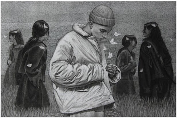 Из всех работ, которыми горжусь, я могу выделить - «Восход», она была создана для проекта «Нетстен» и находится в Москве. Здесь вы увидите, как влюбленные смотрят друг на друга на фоне панелек. Мне очень понравился потрет девушки, он гармоничен и по деталям, и по цветам – сочетание холодного фона и теплого оттенка кожи. Очень классно получилось. Если говорить про работы меньшего масштаба про холсты в графике, моя любимая работа: «Тени», где главный герой выпускает из груди бабочек на фоне силуэтов людей.