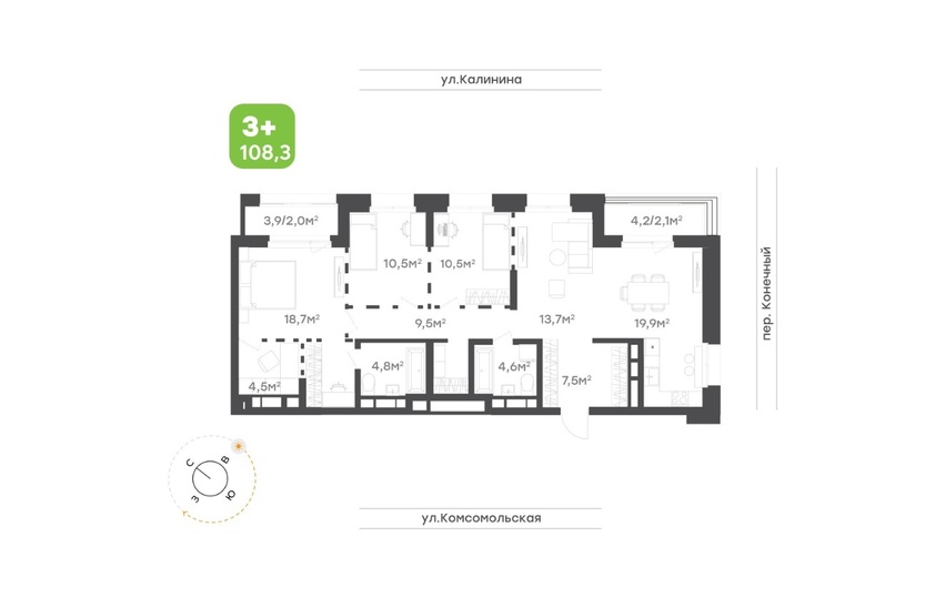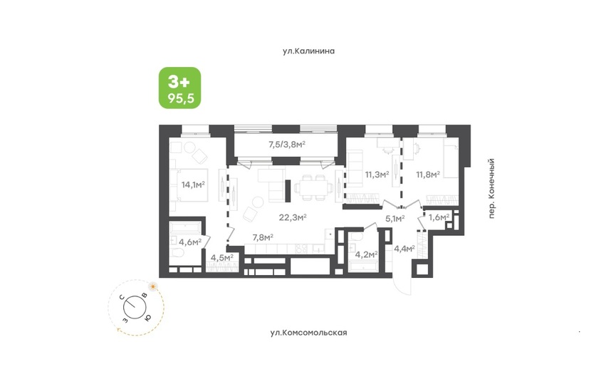 На типовых этажах переработаны планировки форматов 1+ и 2+ с ориентацией на ул. Калинина.