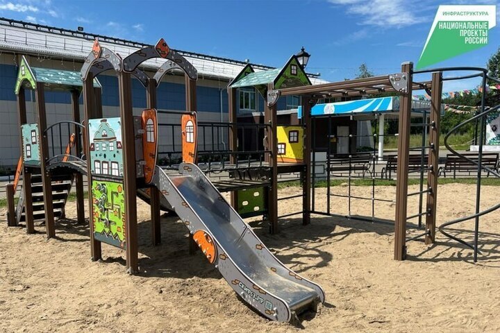 В обновленном пространстве уложили новую брусчатку, установили парковые диваны с навесом, а также смонтировали спортивно-игровой комплекс и качели для детей.