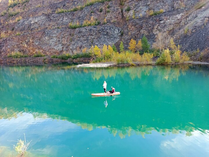 Первой нашей целью было озеро Изумрудное – недалеко от ГОК «Русолово» и поселка Горного. На картах оно обозначено обыденным словом «карьер». Но на деле – это немаленький водоем с бирюзовой водой, окруженный отвалами породы, из которой раньше добывали олово. Вокруг вершины поросших лесом сопок, кедровый стланик и осыпи самых разных оттенков! У берега кто-то заботливо поставил лавочку. Мы приготовили завтрак, надули сапы и вышли на водную гладь. Солнце выглянуло из-за склона горы и расцветило каждый валун. Вода стала изумительного яркого оттенка. Озеро оказалось намного больше, чем выглядело. Было тихо, безветренно, и склон горы идеально отразился в воде. Природа обеспечила нас захватывающими видами и красивыми фото.